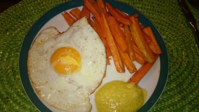 Zum Abendessen gab es Chili-Karottenpommes mit selbstgemachter Mayo und Spiegelei