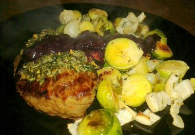 Rindersteak mit Kräuterkruste an Rosenkohl-Fenchel-Gemüse und Blaubeersauce