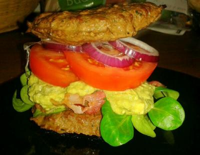 - Wenn die Patties gar sind, wie folgt schichten: Pattie, darauf Feldsalat, Bacon, Avocadocreme, Tomaten, Zwiebeln, Pattie