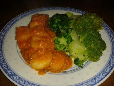 - Garnelen in die Pfanne geben, wenn sie anfangen, gar zu werden, Tomatensauce darübergießen und alles 5 min köcheln lassen