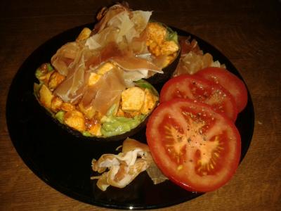 - Avocadocreme in die Avocadoschalen aufteilen, Hähnchen darauf verteilen