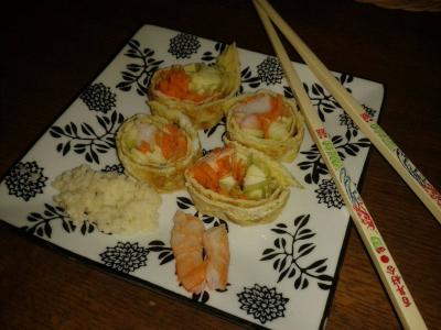 - Auf einer Hälfte des Eies die Gemüsejulienne verteilen, Garnelen oder Lachs dazugeben und fest aufrollen