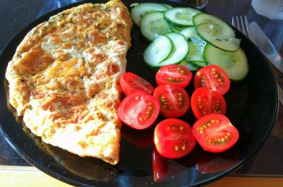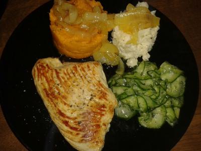 Putenschnitzel an Süßkartoffel- und Blumenkohlpüree mit Zwiebelfett, dazu frischer Gurkensalat