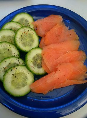 Räucherlachs (ohne Räuchersalze und aus nachhaltiger Fischerei) und Gurke, mit Chili-Pfeffer gewürzt