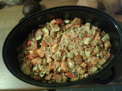 - alle Zutaten in eine ausreichend große Auflaufform geben, mit den Gewürzen vermengen